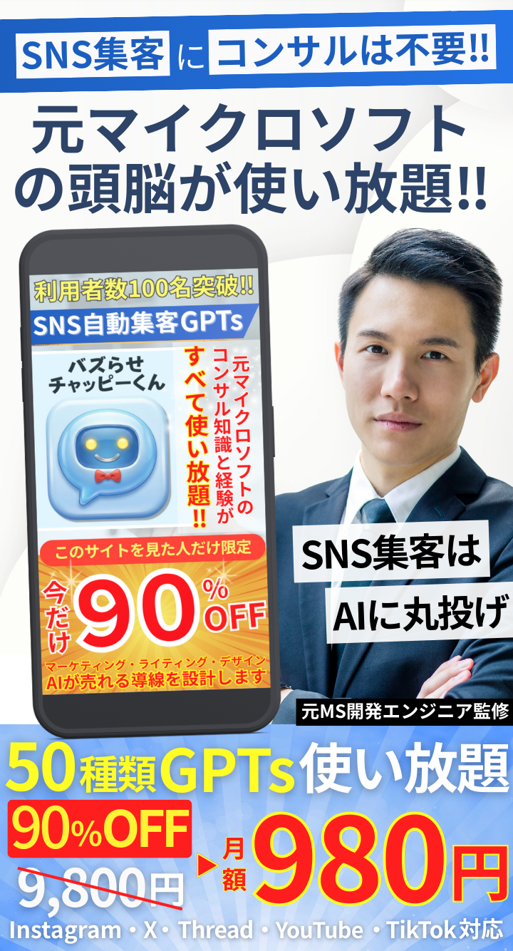 Instagram・TikTok特化AIを含む50種以上が使い放題。元マイクロソフトエンジニアが設計した最高品質のプロンプトで、SNSがバズる環境を即構築。